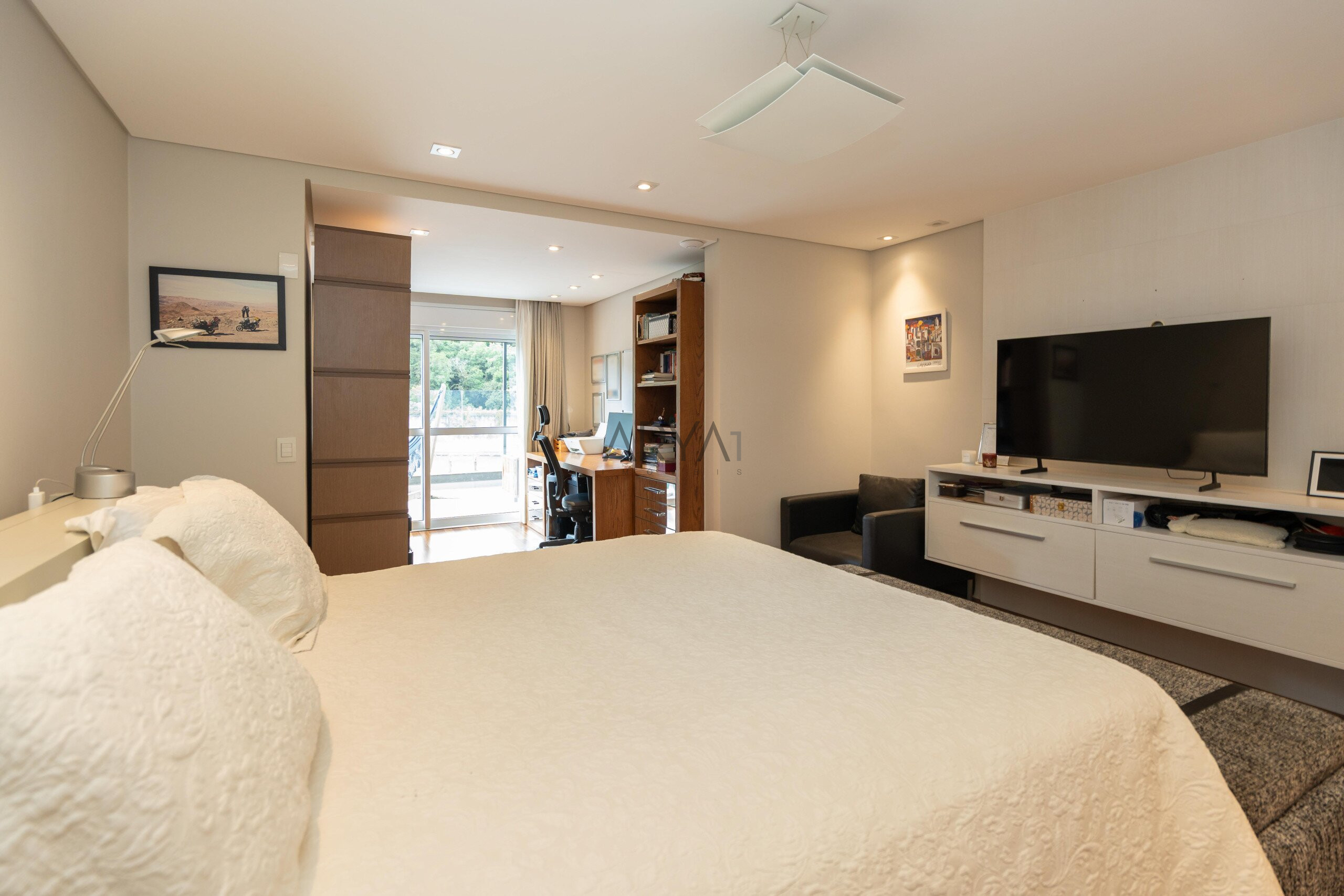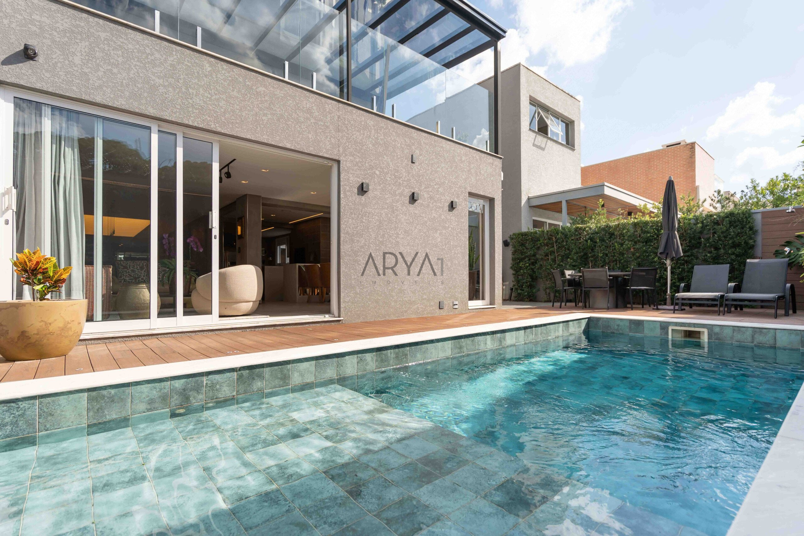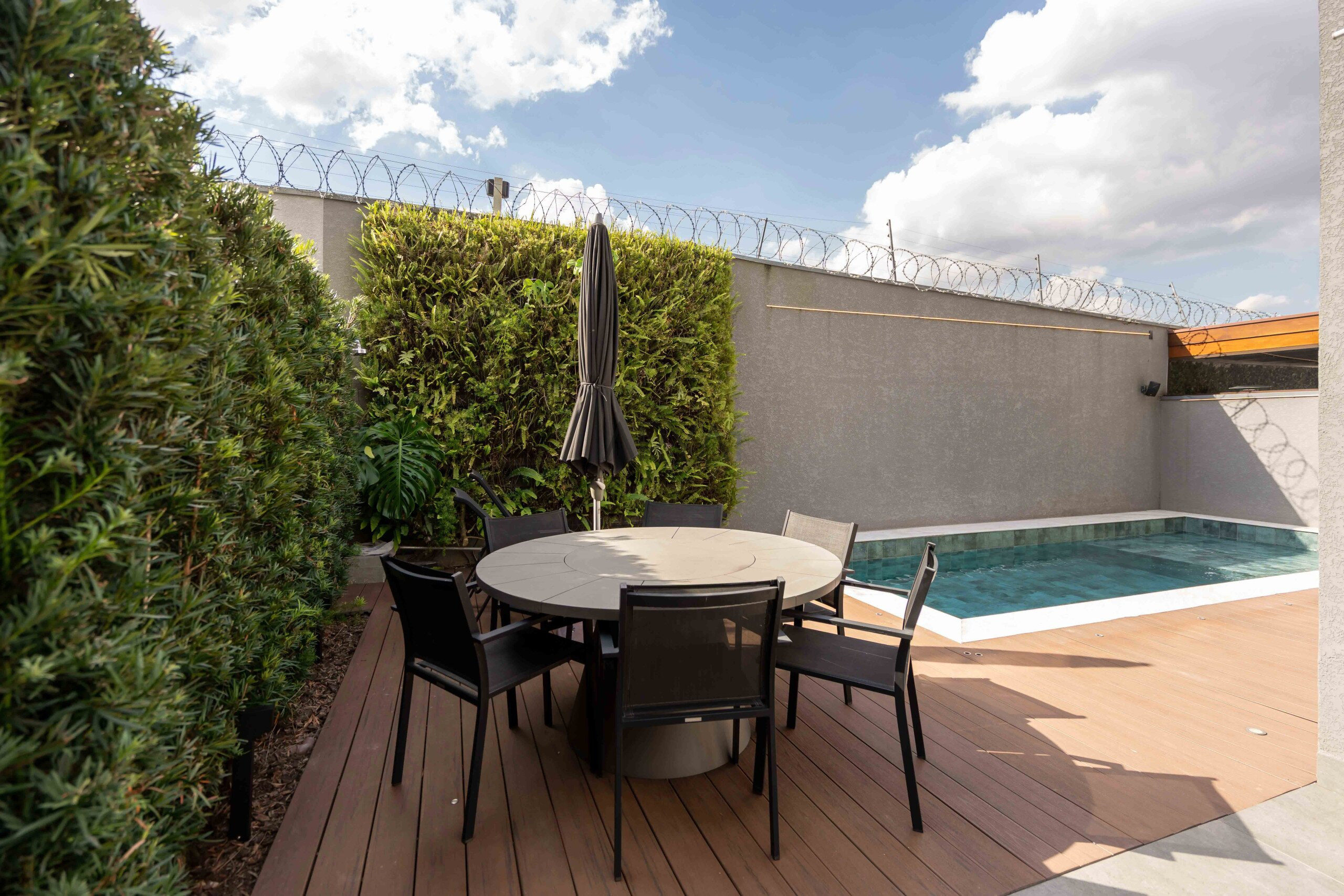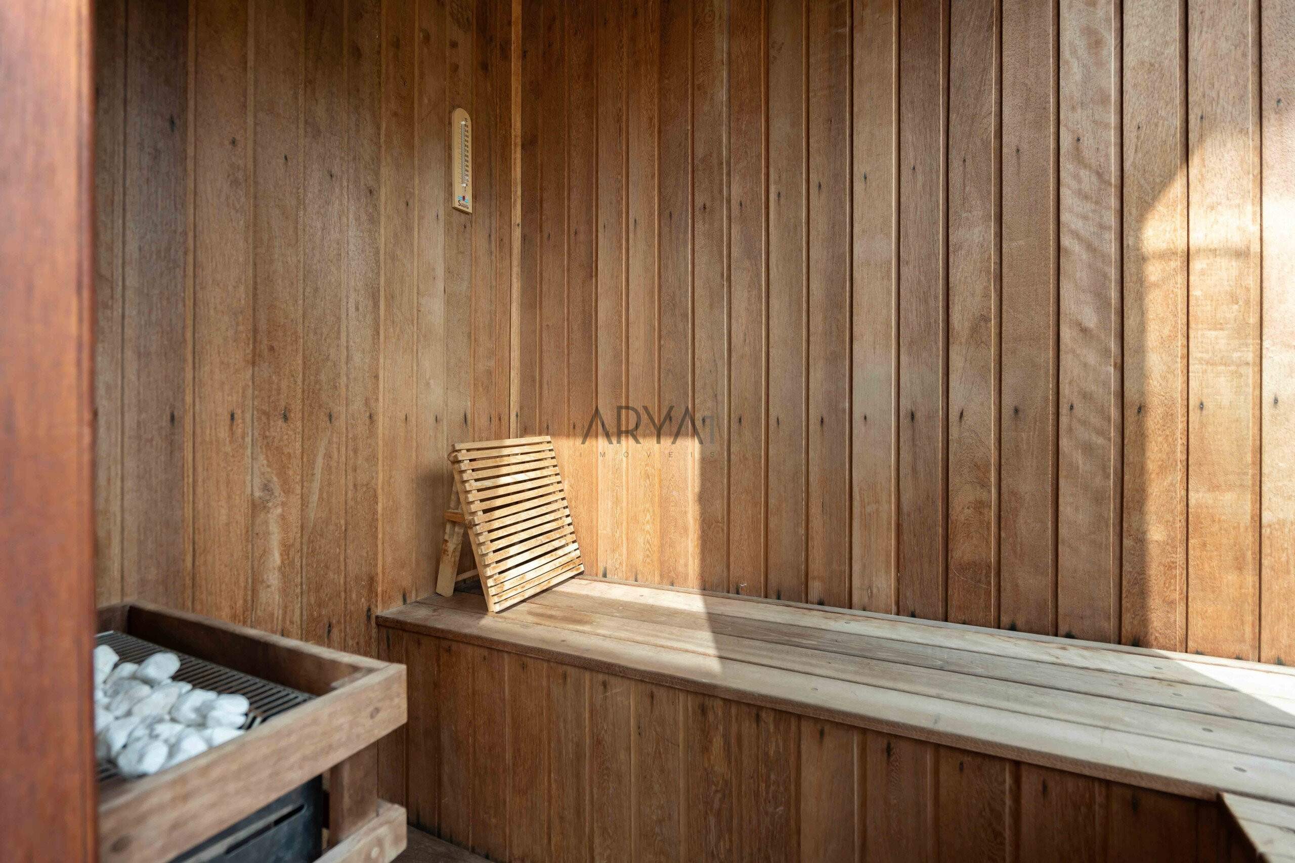 A área externa é um verdadeiro refúgio: piscina aquecida revestida com pedra Hijau, deck em Timbertech, ducha externa, sauna seca com banheiro de apoio e um ambiente ideal para relaxar. A suíte principal se destaca com uma generosa sacada de aproximadamente 30 m².