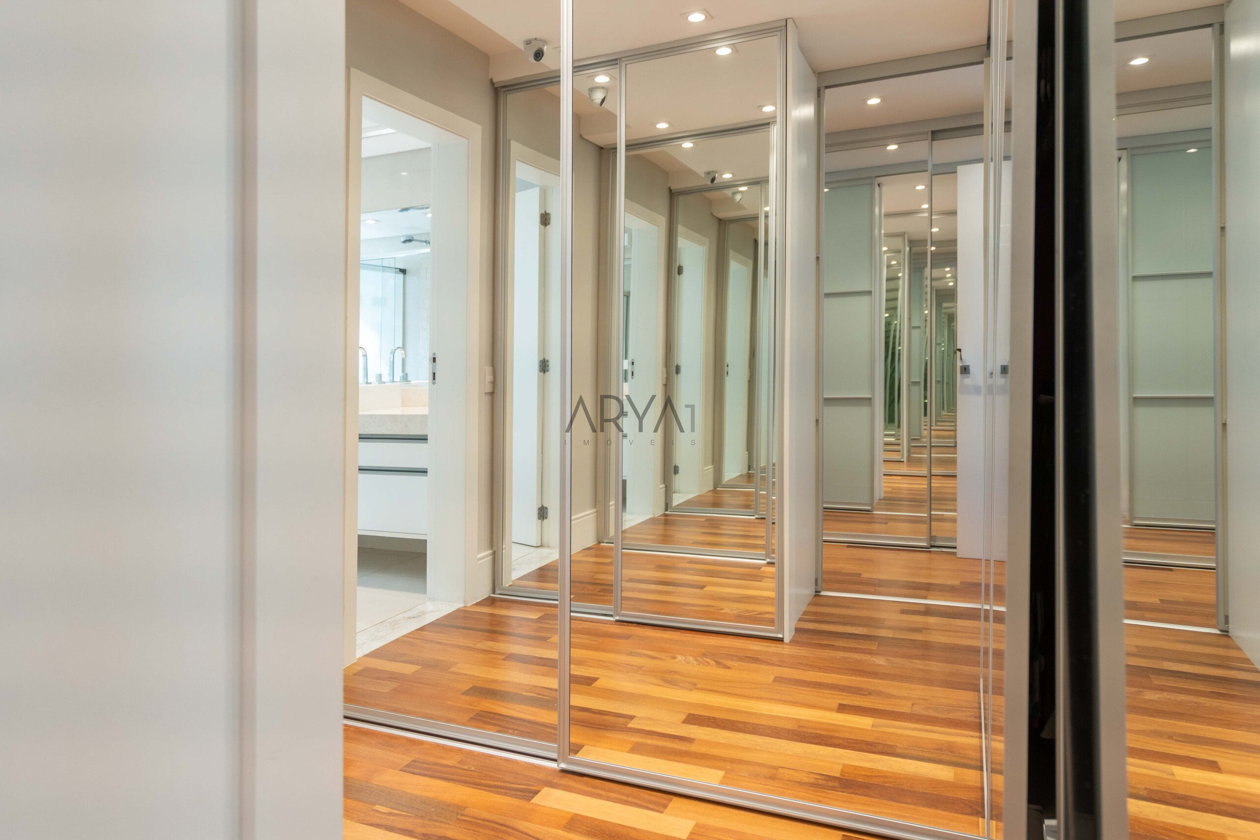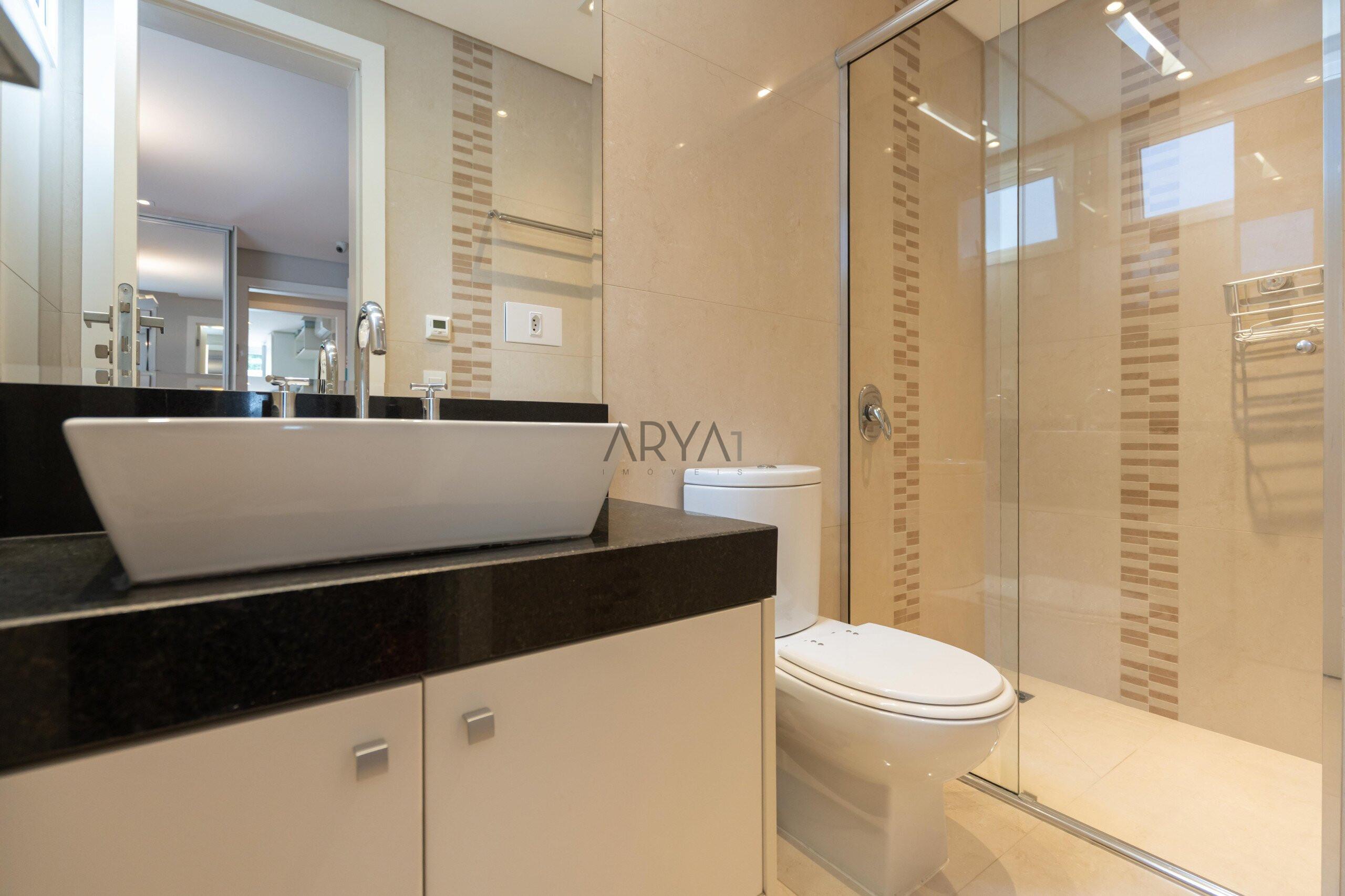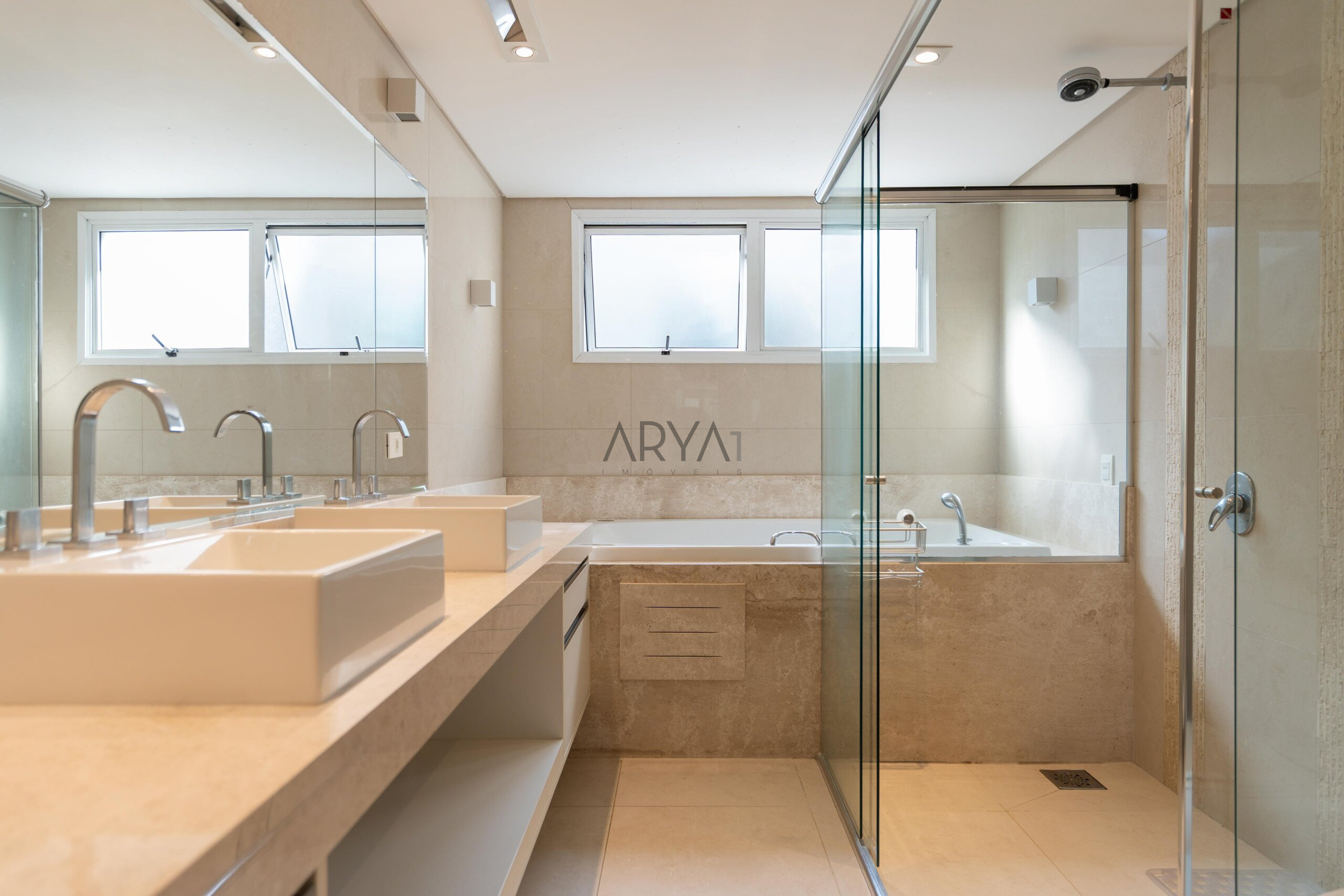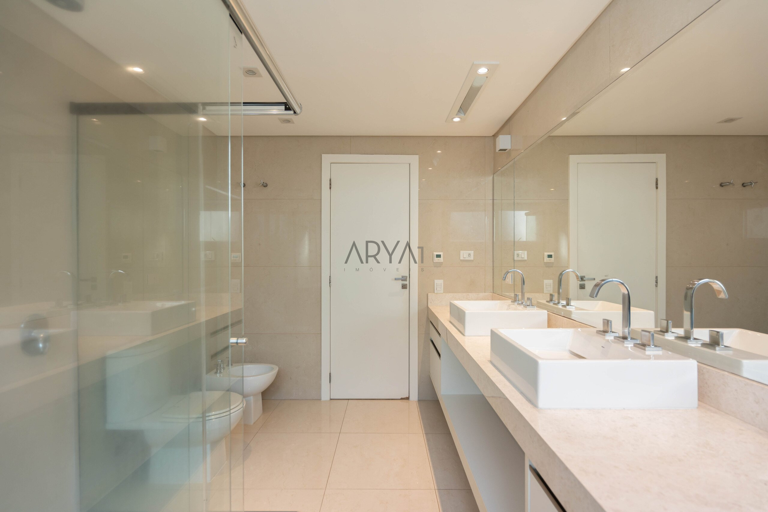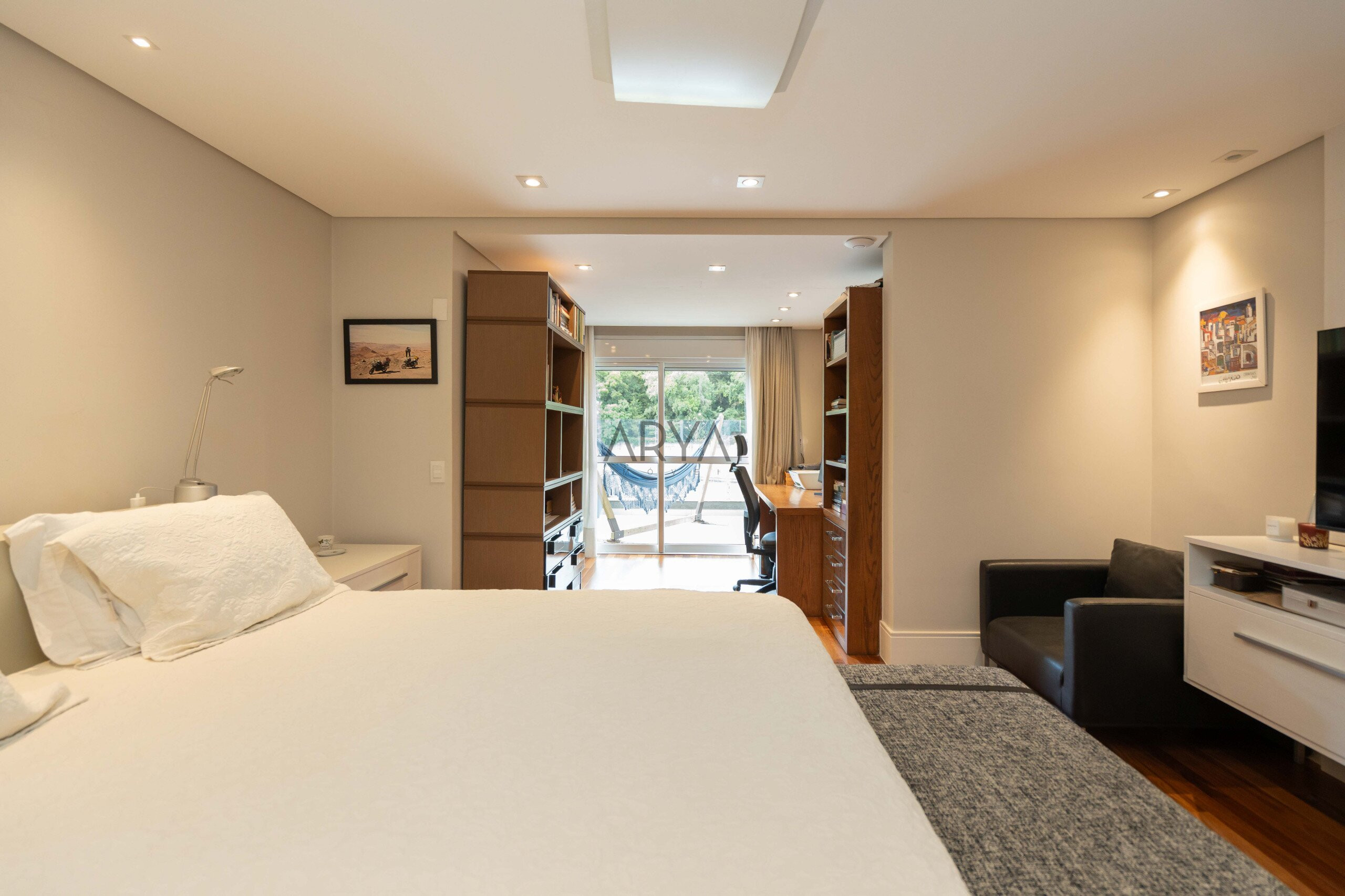 A área externa é um verdadeiro refúgio: piscina aquecida revestida com pedra Hijau, deck em Timbertech, ducha externa, sauna seca com banheiro de apoio e um ambiente ideal para relaxar. A suíte principal se destaca com uma generosa sacada de aproximadamente 30 m².