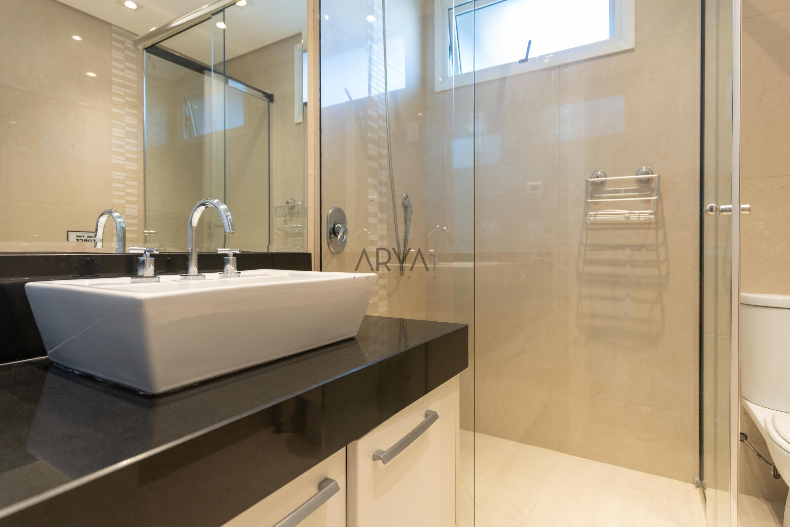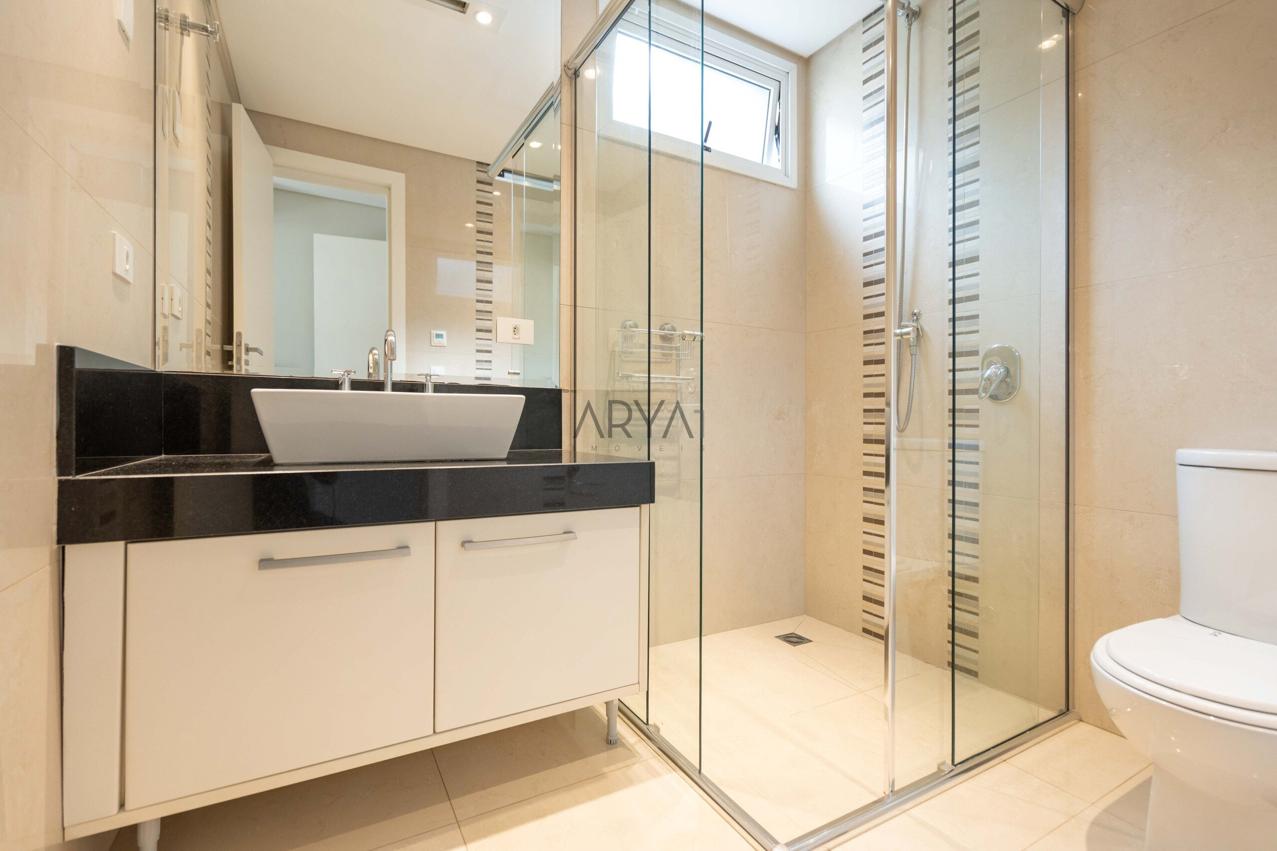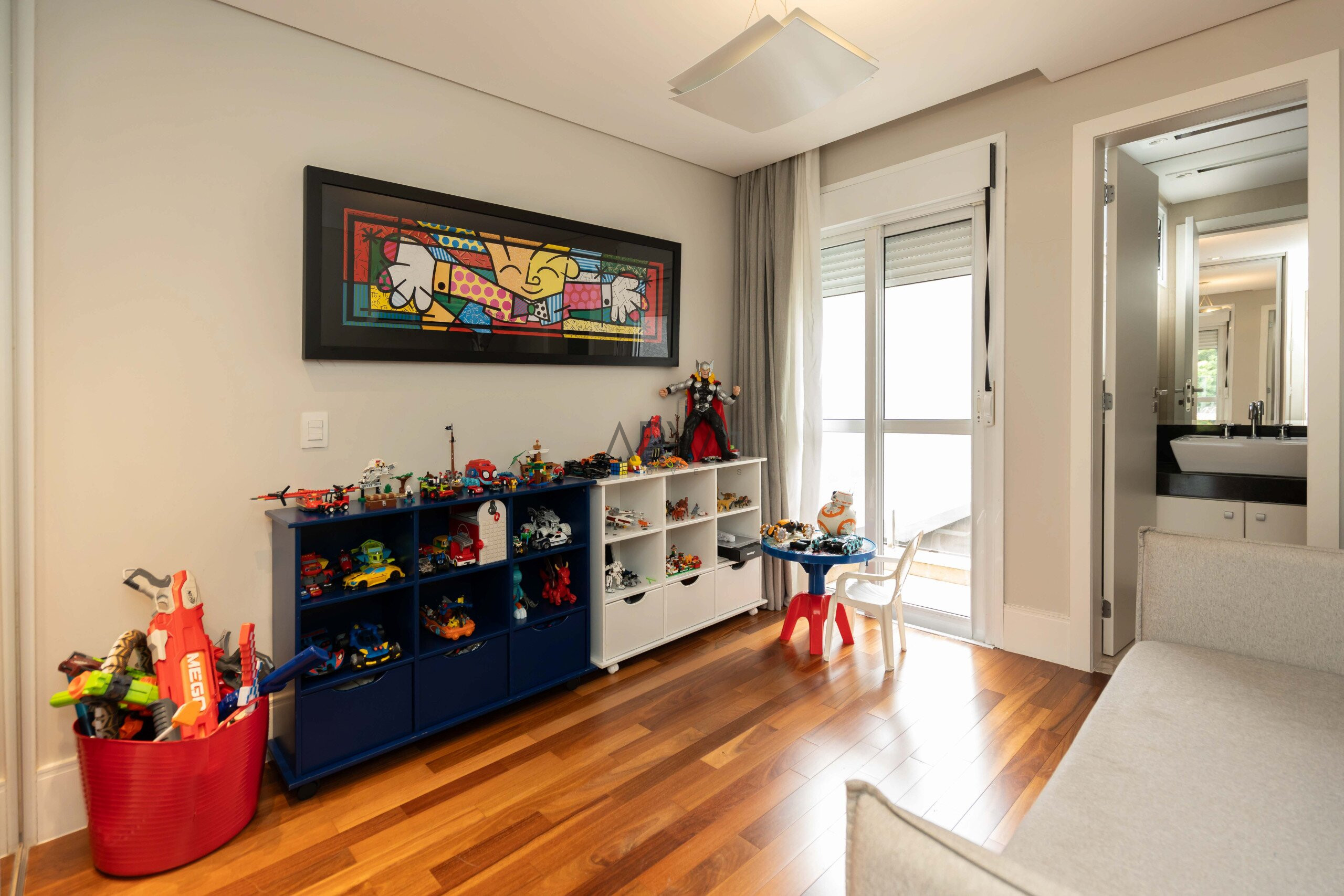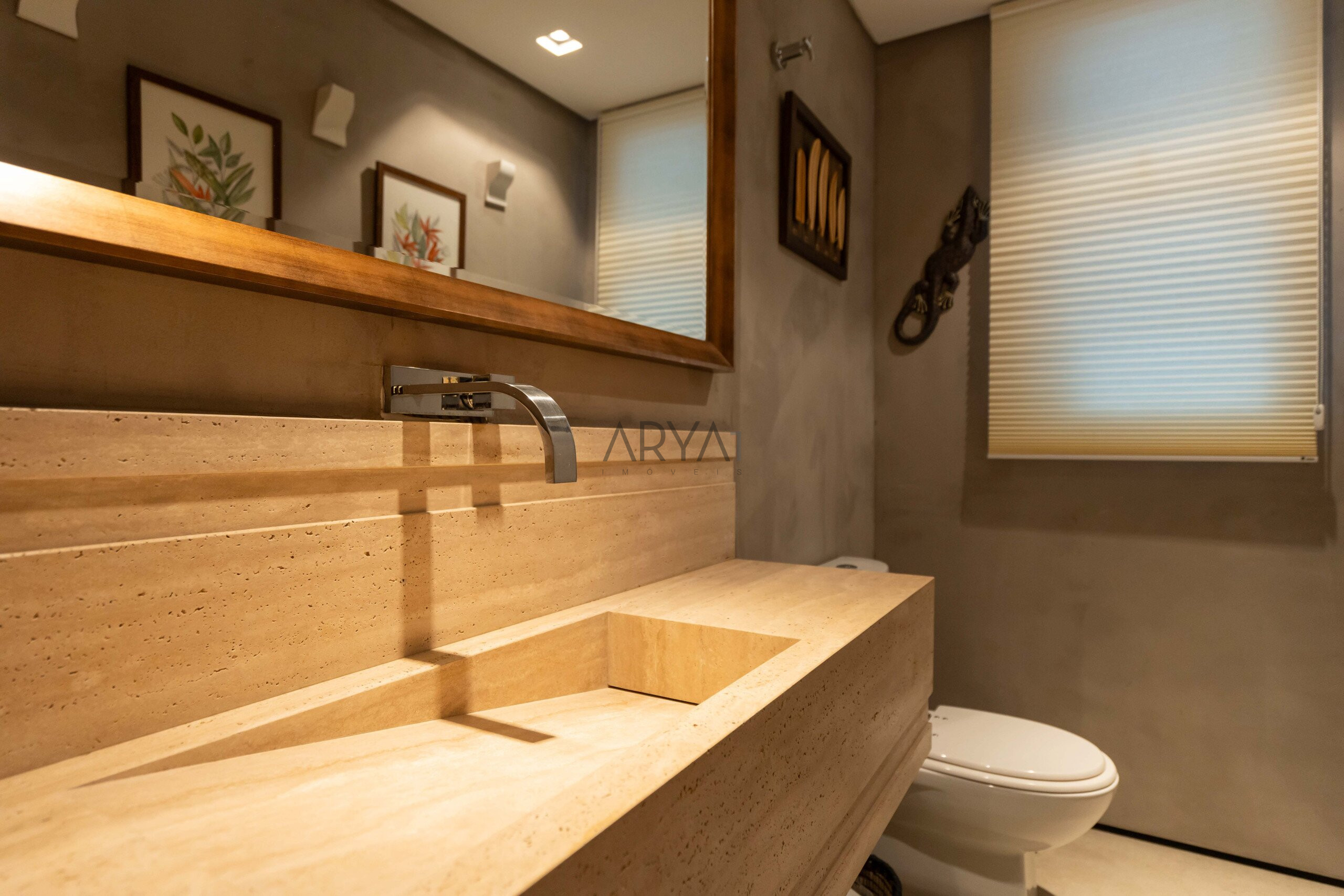 A área externa é um verdadeiro refúgio: piscina aquecida revestida com pedra Hijau, deck em Timbertech, ducha externa, sauna seca com banheiro de apoio e um ambiente ideal para relaxar. A suíte principal se destaca com uma generosa sacada de aproximadamente 30 m².
