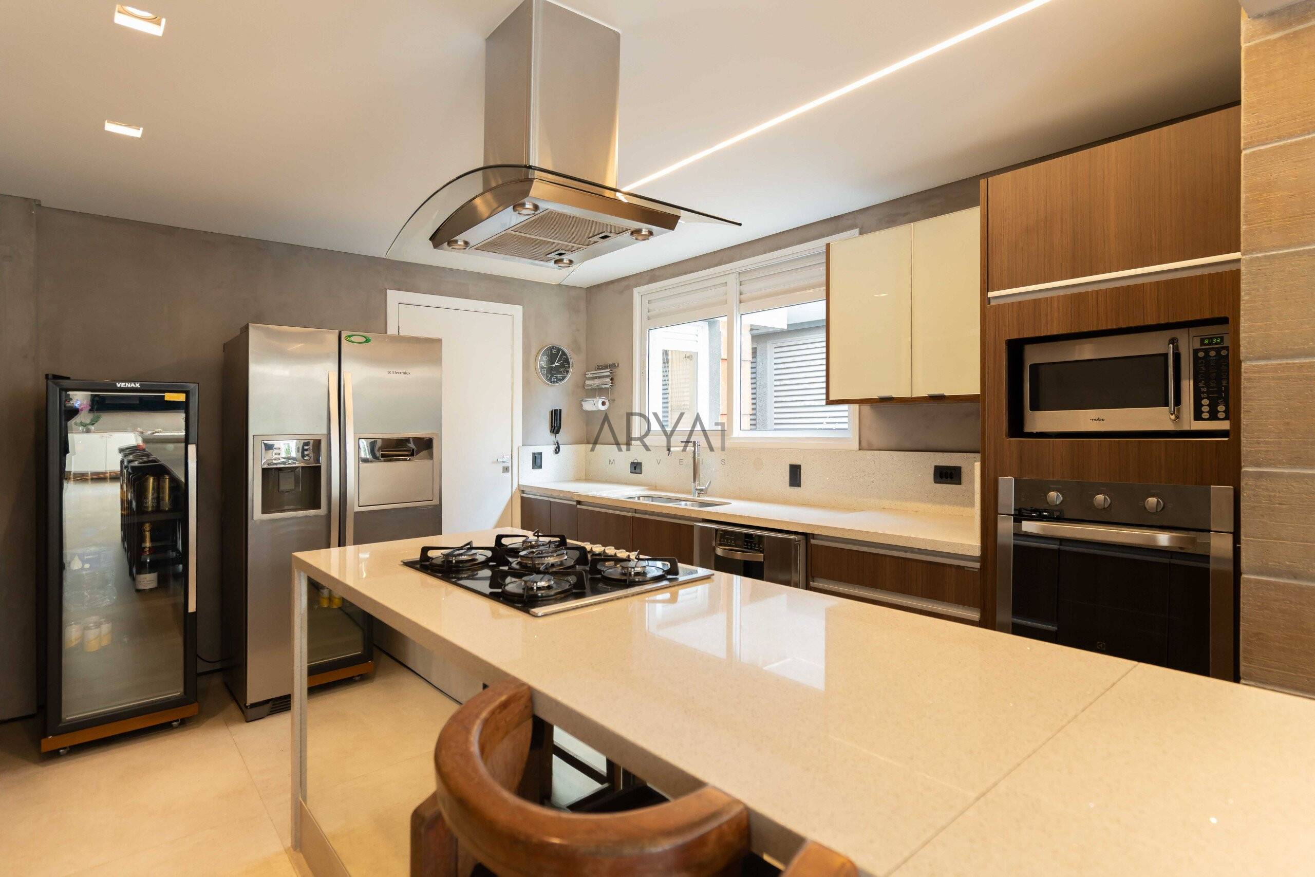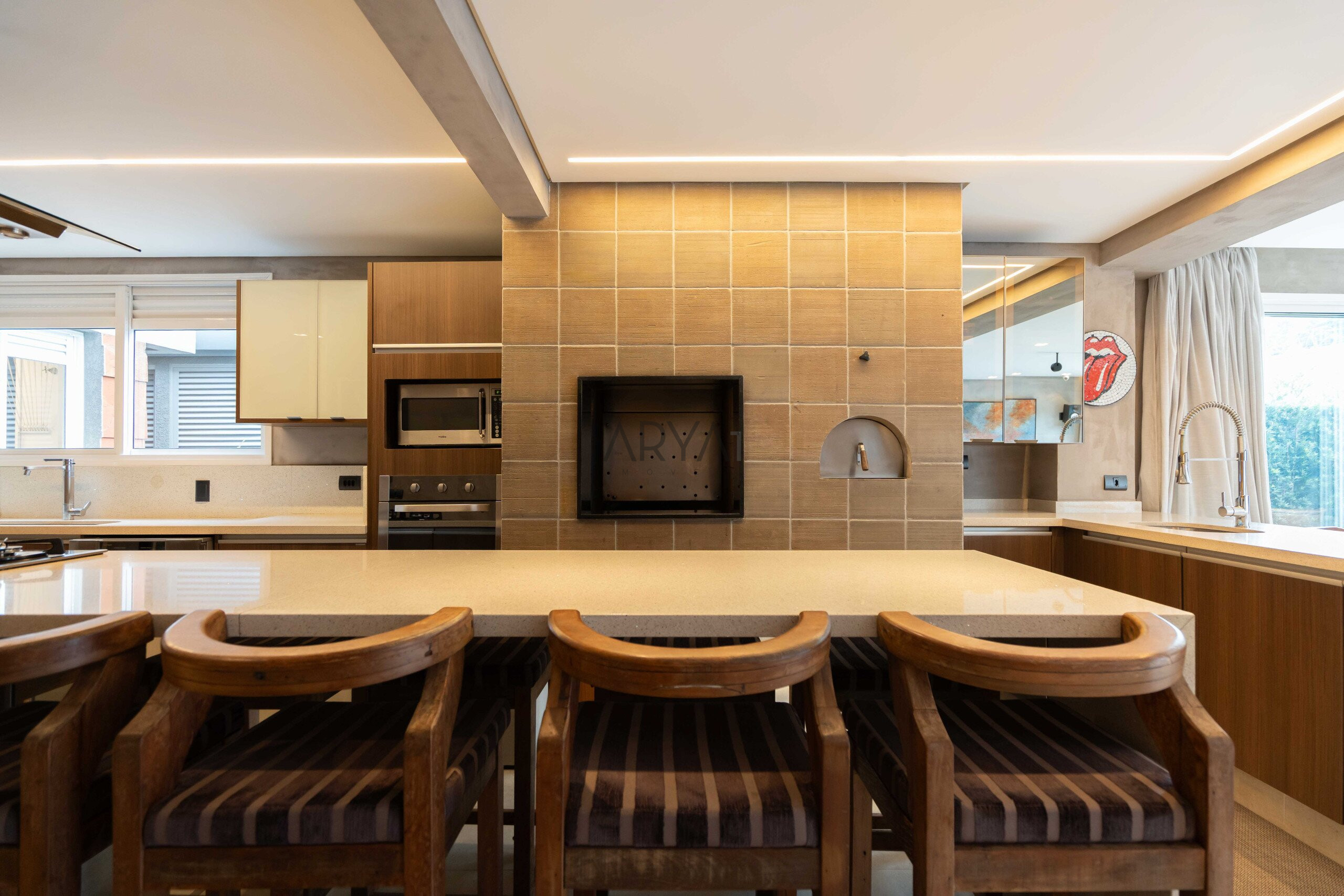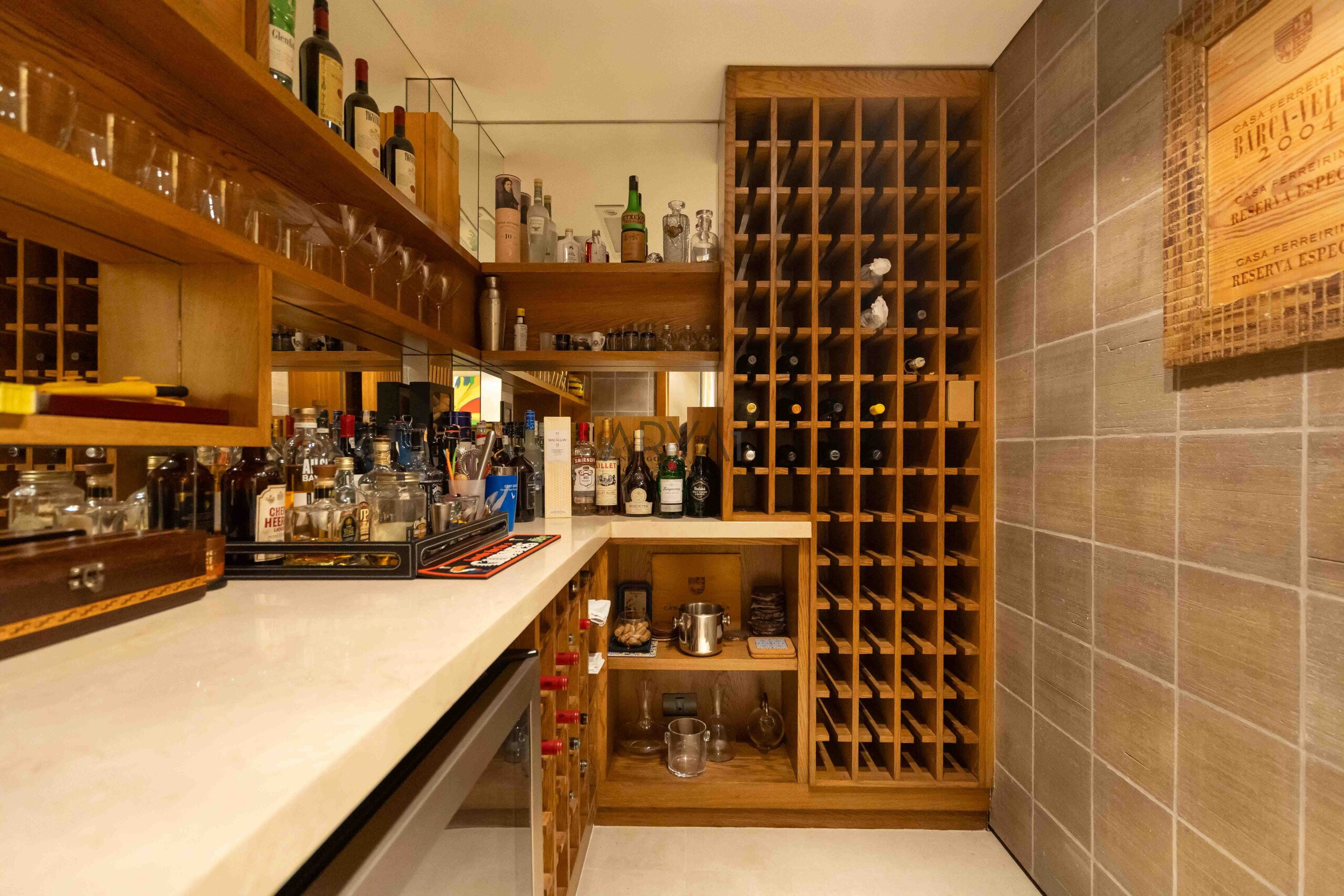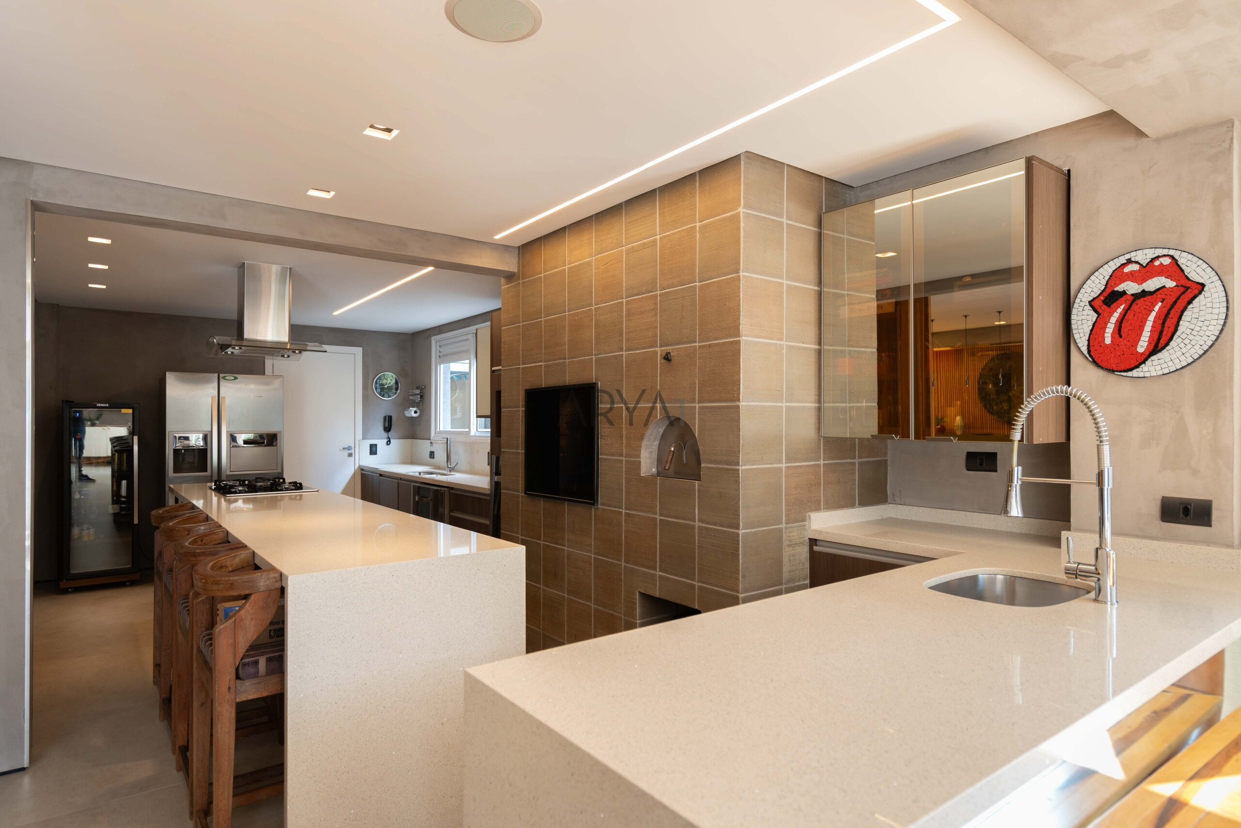 A cozinha é um espetáculo à parte, equipada com armários Florense e bancada em quartzo branco, conectada ao espaço gourmet com churrasqueira e forno de pizza, perfeito para receber amigos e família. Para os amantes de vinho, a casa conta ainda com uma adega com capacidade para 300 garrafas.
