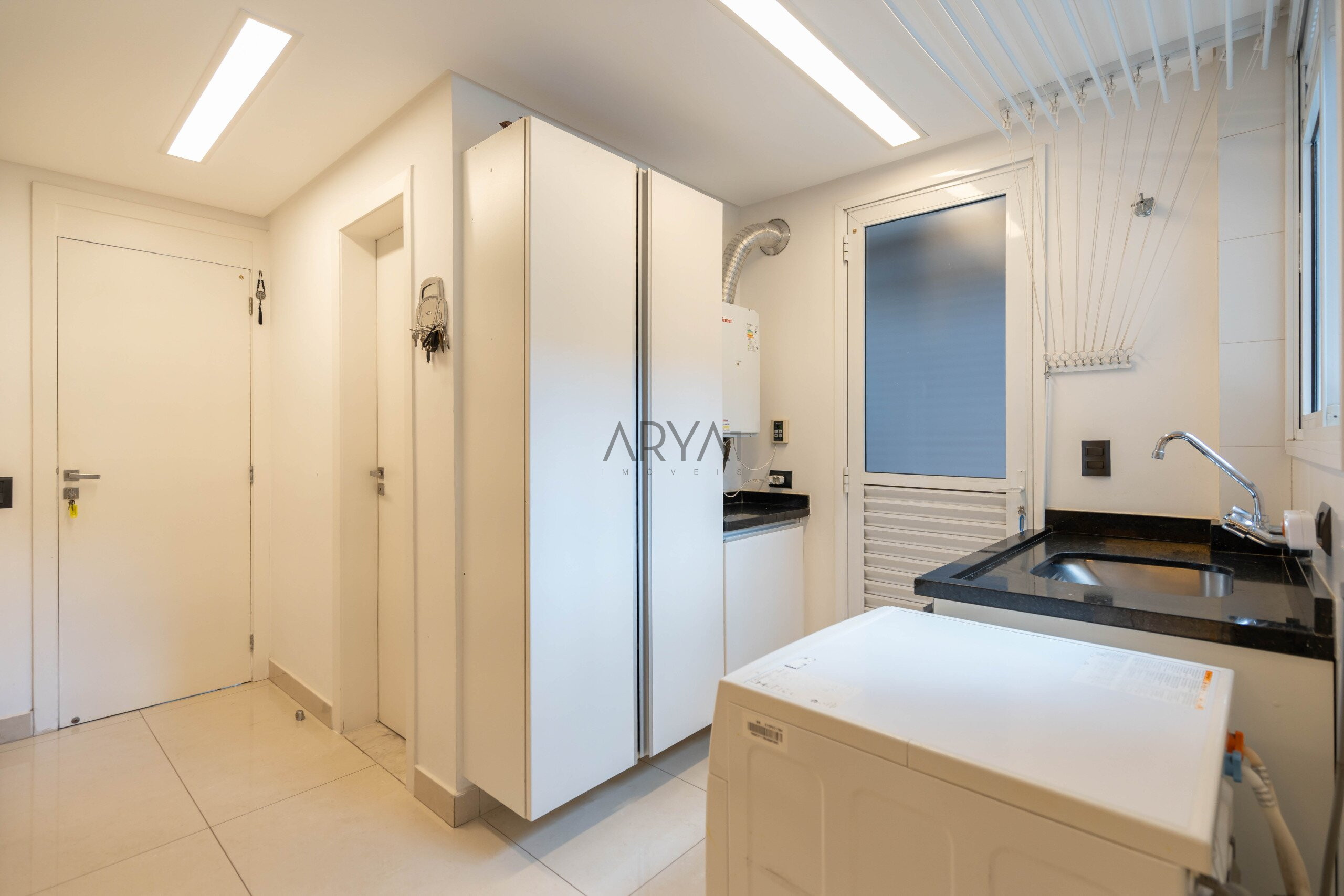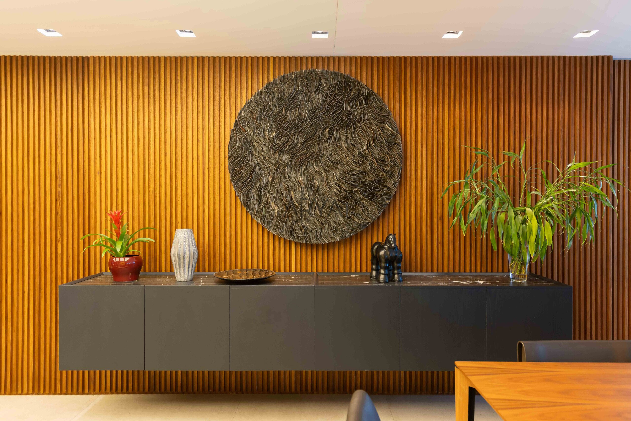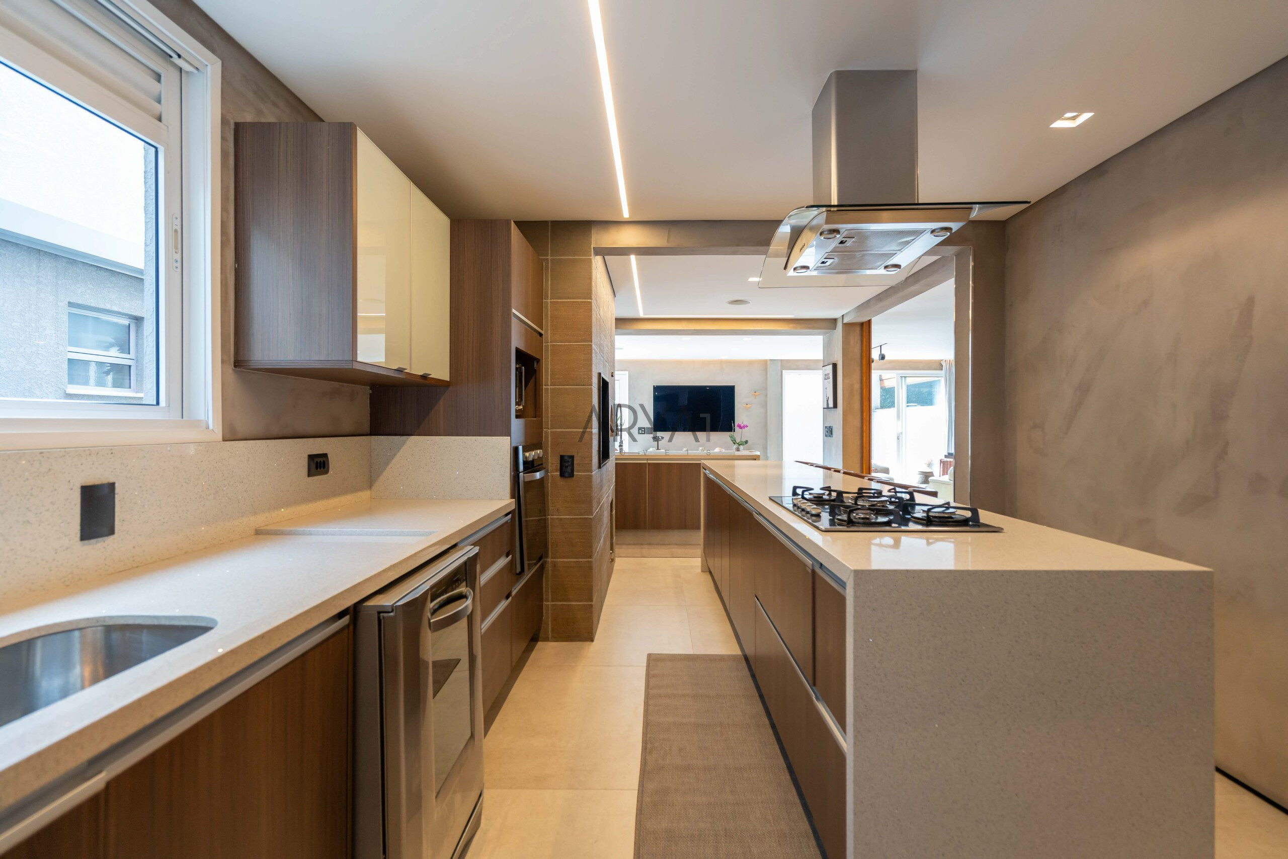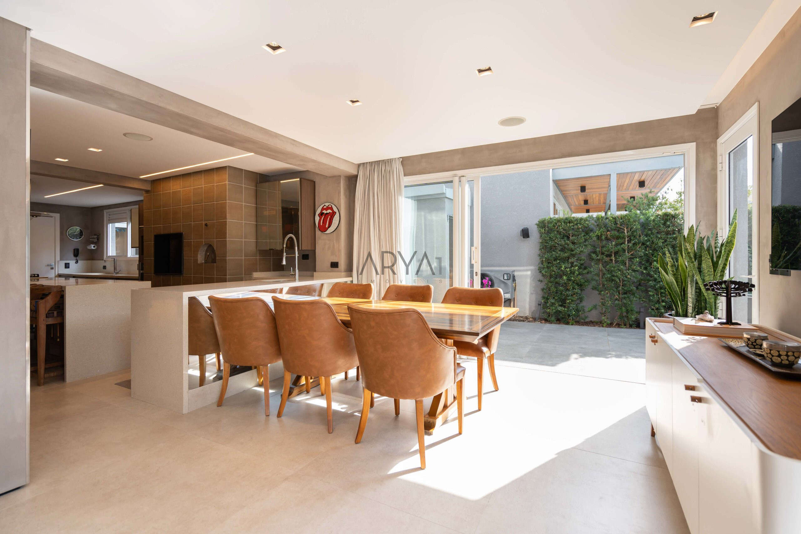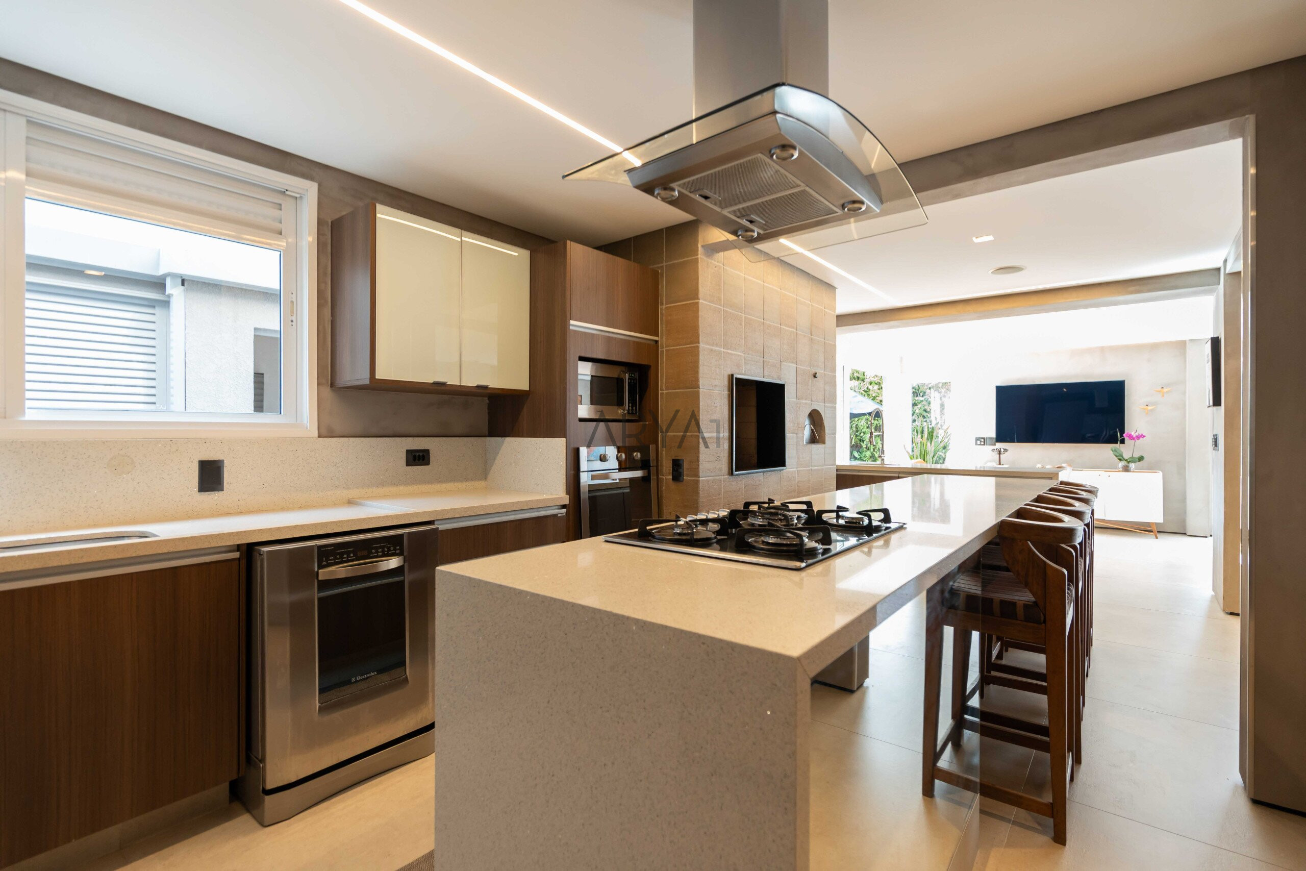 A cozinha é um espetáculo à parte, equipada com armários Florense e bancada em quartzo branco, conectada ao espaço gourmet com churrasqueira e forno de pizza, perfeito para receber amigos e família. Para os amantes de vinho, a casa conta ainda com uma adega com capacidade para 300 garrafas.