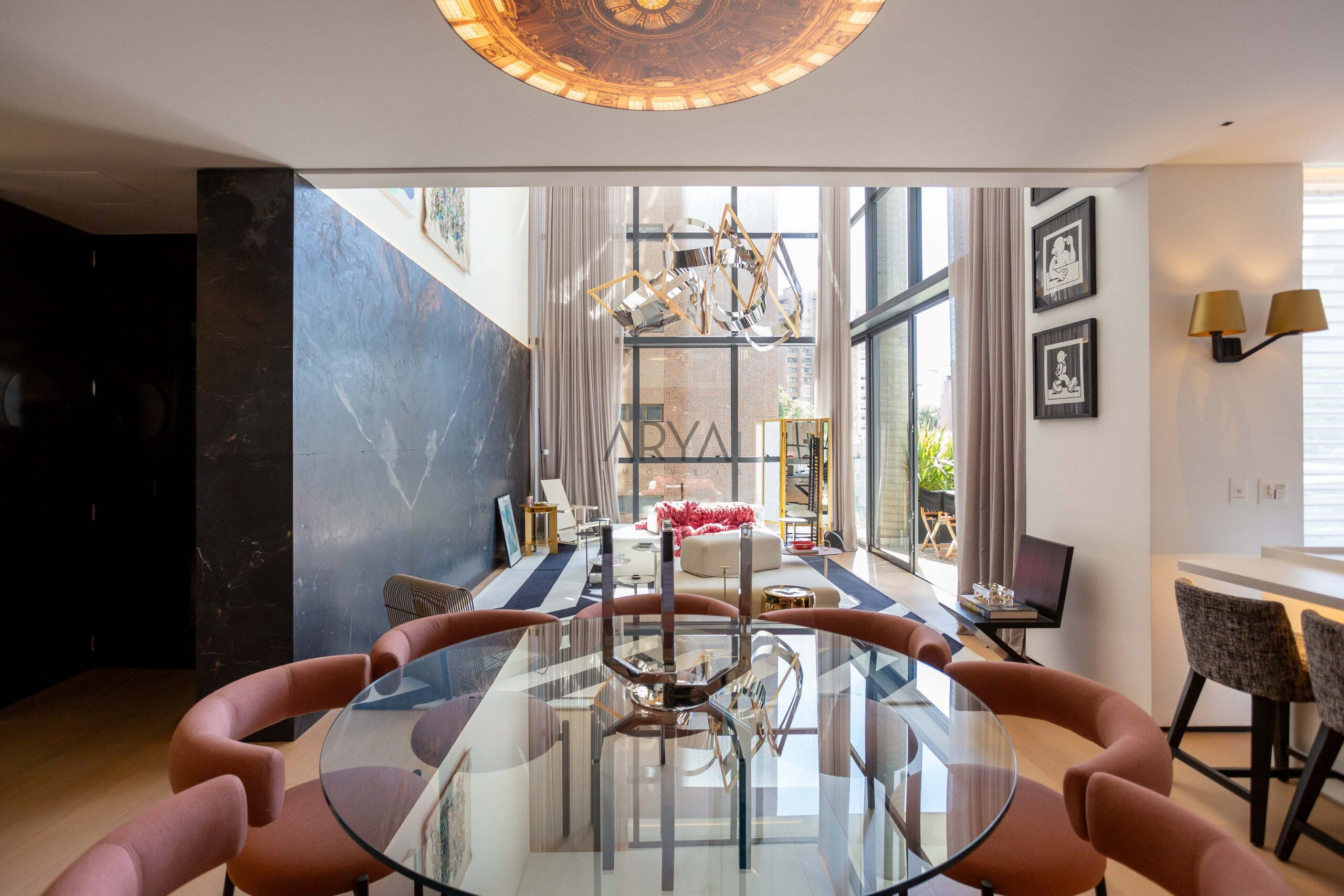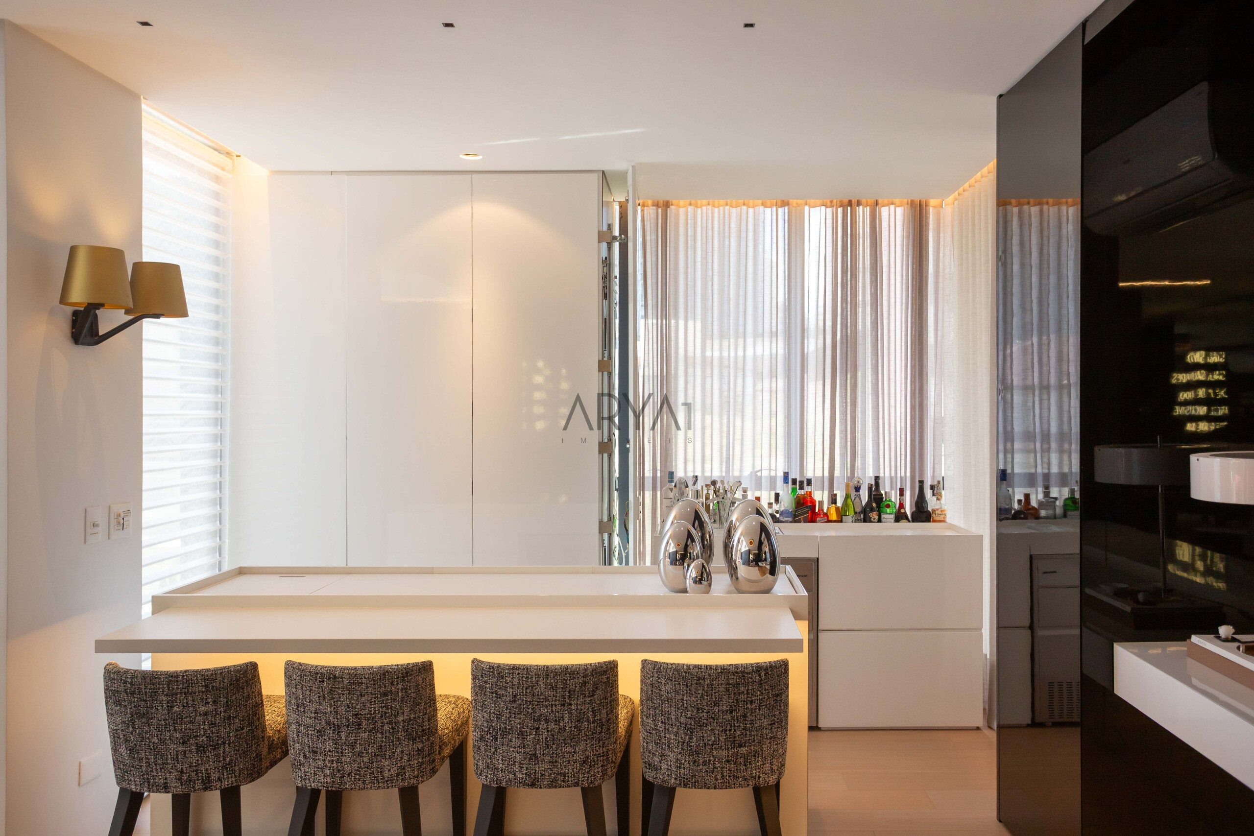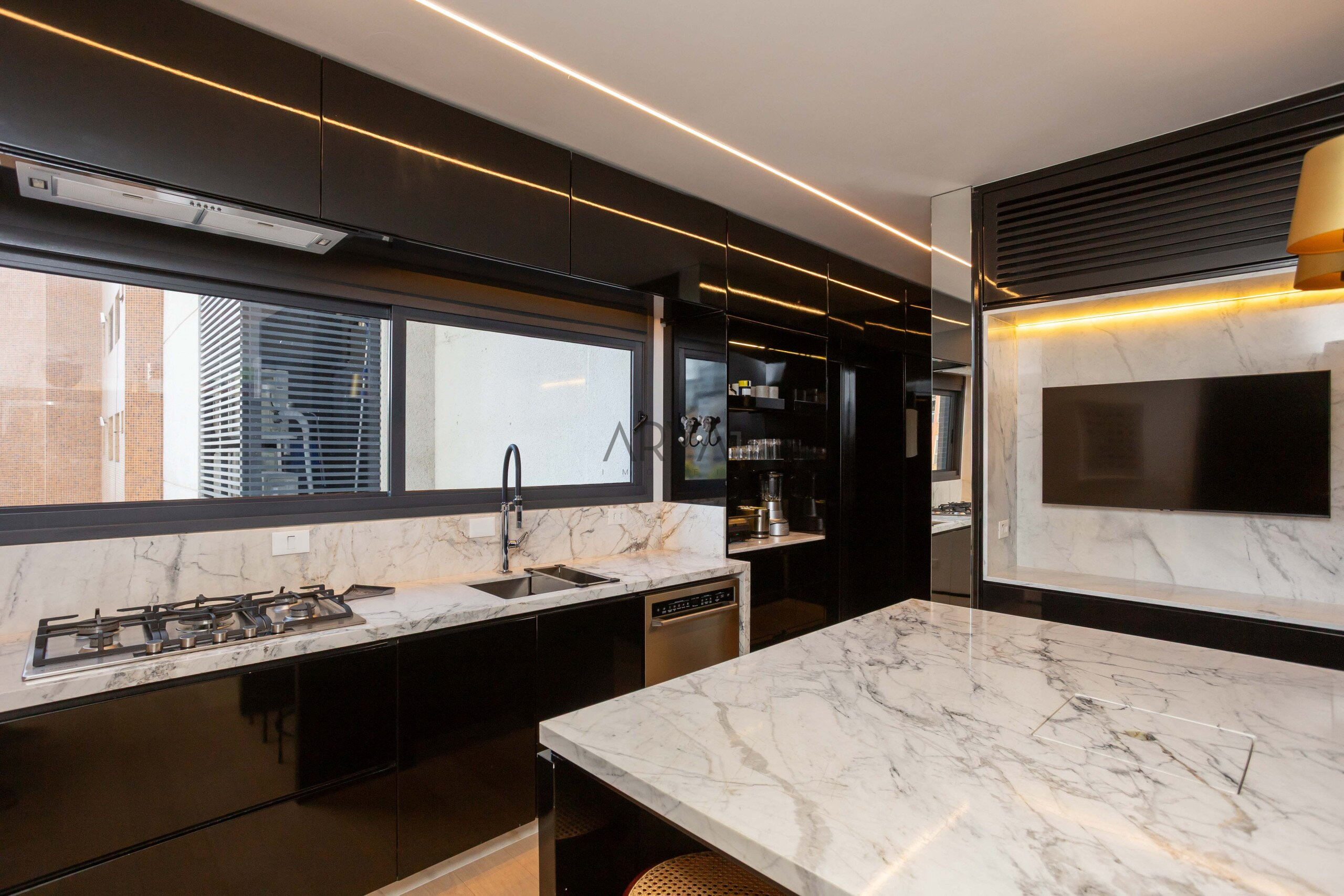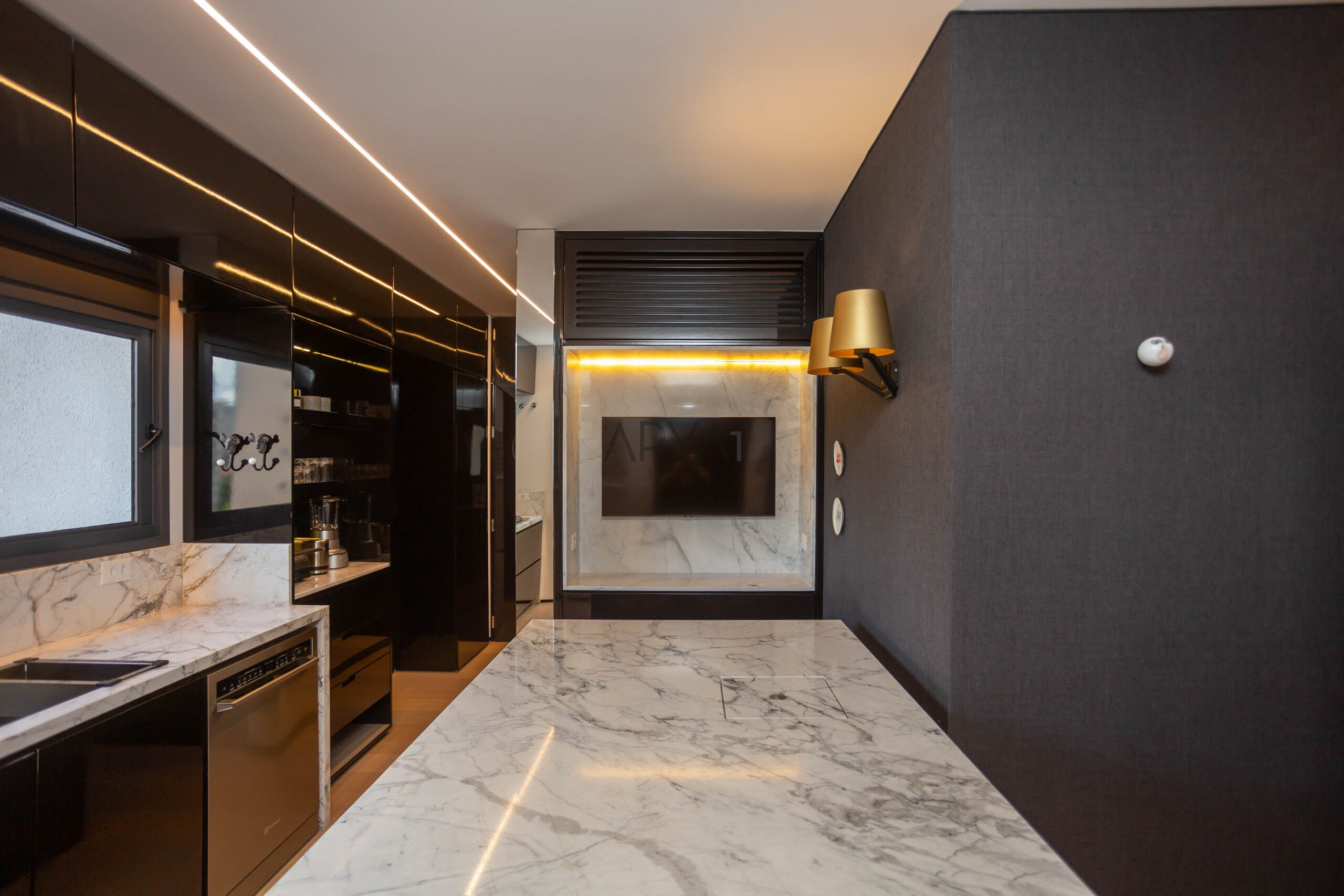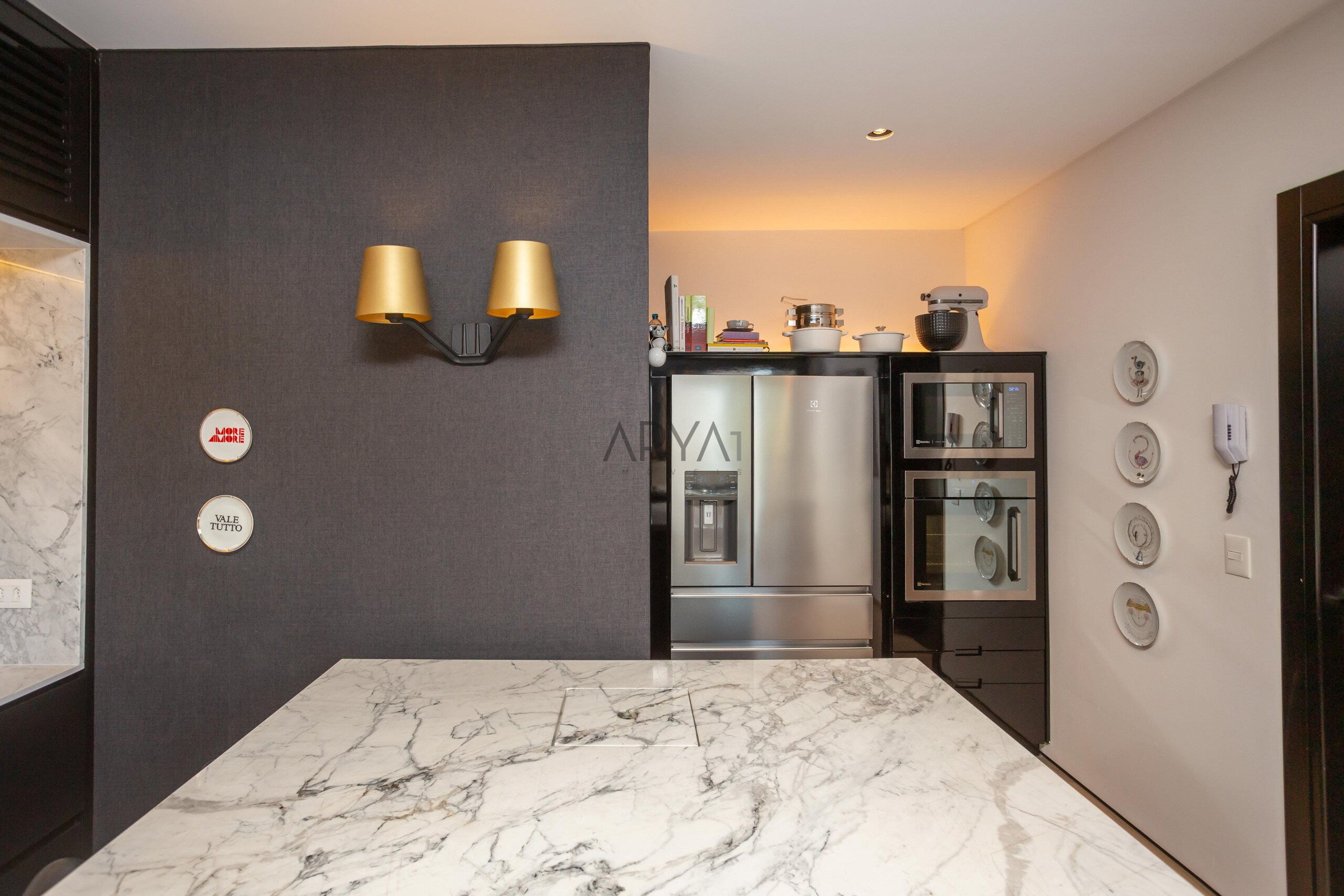A cozinha é equipada com eletrodomésticos da linha Pro Electrolux, incluindo geladeira, cooktop, forno, coifa e televisão. O espaço gourmet conta com frigobar, máquina de gelo, gaveta aquecida Elettromec e o tampo em Dekton Uyuni, garantindo durabilidade e sofisticação.