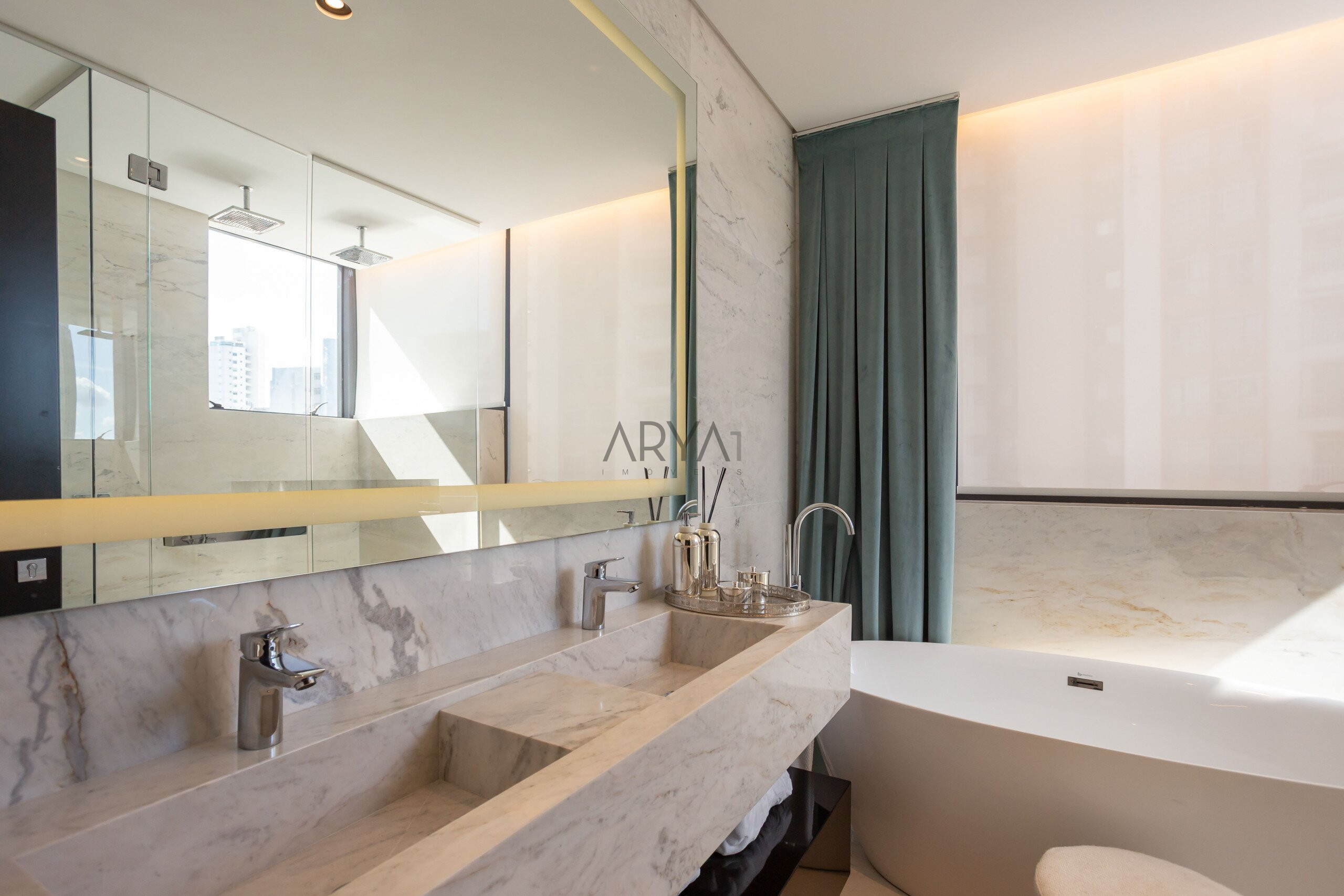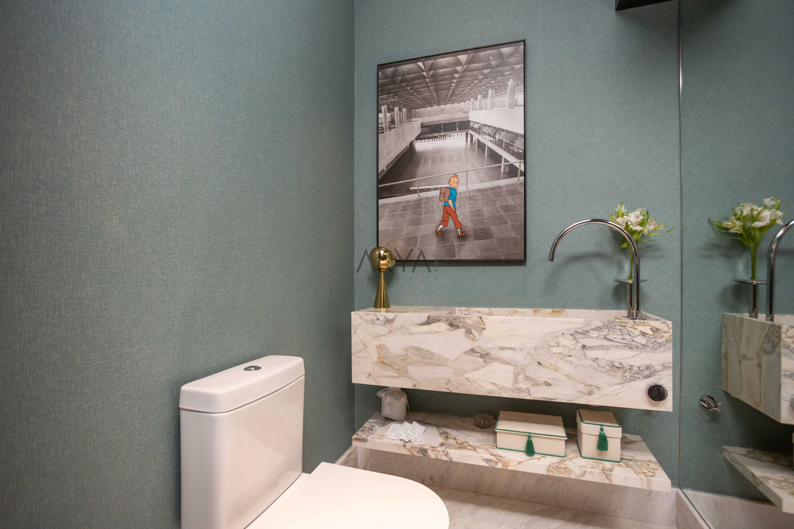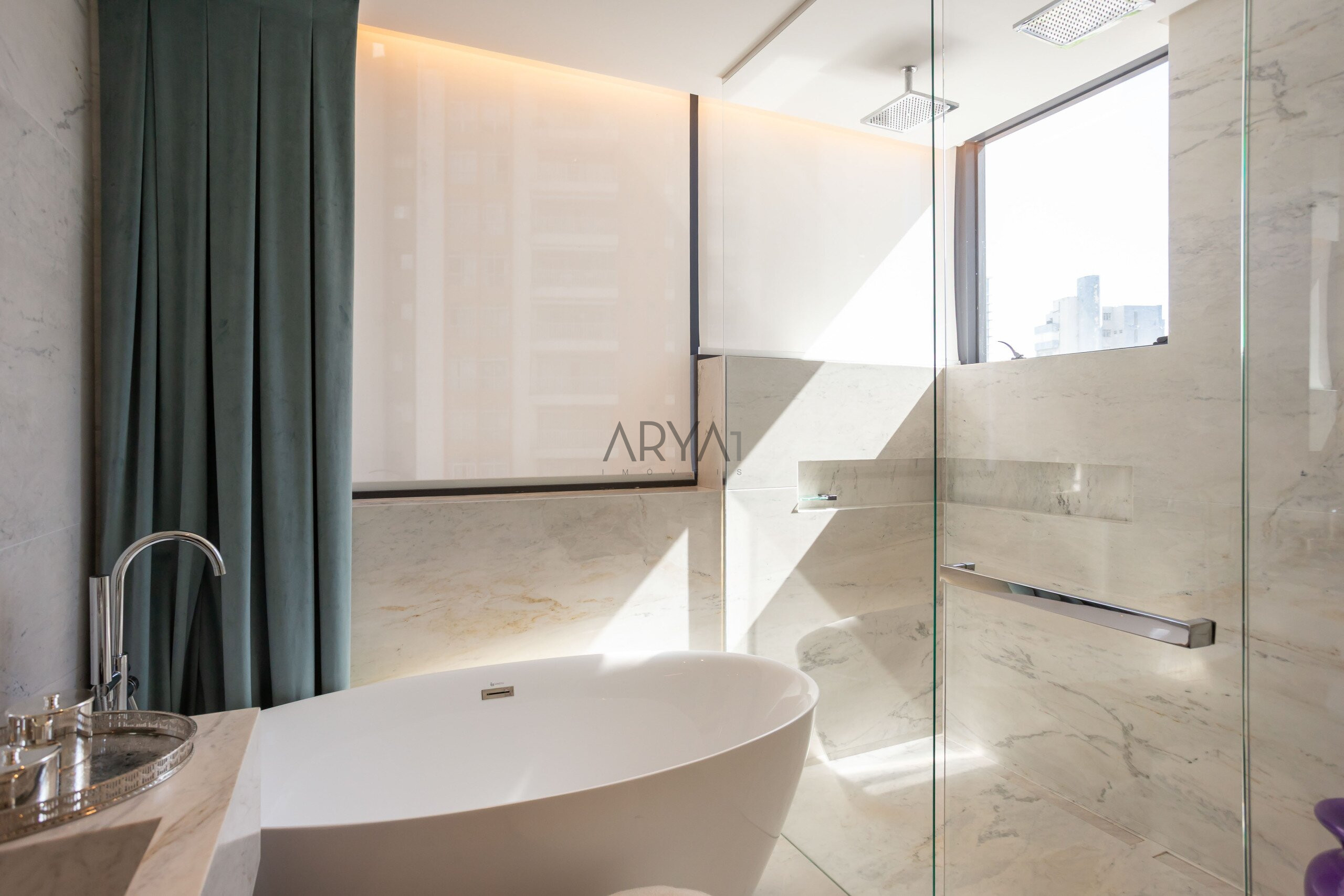 Na área social, o destaque fica para o painel em mármore Michelângelo Nero criando um ambiente sofisticado e contemporâneo. O lavabo, assim como a varanda, são revestidos em mármore branco Paraná , garantindo um toque de sofisticação. O piso aquecido com automação está presente em todos os ambientes, exceto na cozinha, área de serviço e lavabo, proporcionando conforto térmico em qualquer estação. O banheiro da suíte máster é em mármore branco Paraná e os banheiros das outras duas são revestidas em mármore Gris Armani, enquanto o restante do apartamento possui um belíssimo piso de madeira carvalho nordic.